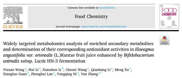 【学术前沿】动物双歧杆菌乳亚种HN-3发酵东方沙枣中增加的次级代谢产物的广靶代谢组学分析和抗氧化