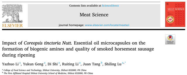 The present study evaluated the effect of Coreopsis tinctoria Nutt. essential oil (CEO) and its microcapsules (CEOM) on the accumulation of biogenic amines and the quality of smoked horsemeat sausage during fermentation. The results showed that CEOM is a promising natural preservative to improve the quality and safety of meat products by inhibiting the growth of microorganisms, biogenic amines and oxidation.