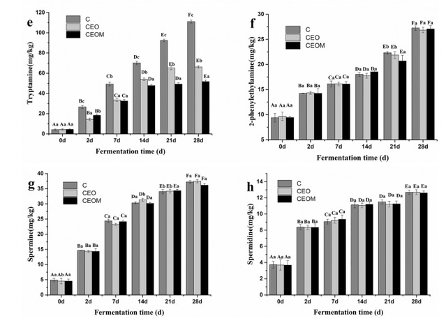 Fig. 4. Influence of CEO and CEOM on the formation of biogenic amines of Xinjiang smoked horsemeat sausage during ripening (mean ± S.E.). Note: C, control; CEO, Coreopsis tinctoria essential oil; CEOM, Coreopsis tinctoria essential oil microcapsules. A-F Means followed by different letters in the same sausage group, differ among them at P < 0.05. a-c Means followed by different letters in the same storage time, differ among them at P < 0.05. nd, not detected