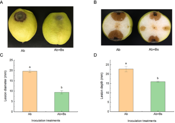 库尔勒香梨(Pyrus siniangensis Yü)被誉为“中国蜜梨”和“水果王子”,是主要种植在中国西部新疆库尔勒地区的传统品种。“库尔勒”香梨果实经济价值显著,然而采后病害,特别是由链格孢菌引起的黑头病,在贮运和销售过程中造成较大损失。通过拮抗微生物进行生防控制是减少果实采后腐败的一种环境友好且有效的方法。生防微生物通过营养和空间的竞争、水解酶和抗真菌化合物的合成以及生物膜的形成的方式直接抑制病原菌,或者通过系统获得性抗性(SAR)和诱导系统性抗性(ISR)控制采后病害。芽孢杆菌作为一类重要的拮抗微生物,被认为是开发水果采后生防制剂的重要候选微生物,但不同枯草芽孢杆菌菌株的拮抗活性、抑菌谱以及在不同果实上的采后生防效果均存在较大差异。