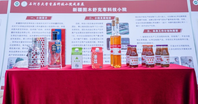 在展区内,图木舒克枣科技小院驻派研究生彭波介绍到,在食品学院单春会教授团队和博士服务团的指导下,科技小院围绕红枣精深加工和综合利用进行研究,着眼于红枣增产不增收和企业精深加工科技水平不足等实际困难,积极推进兵地深度融合和科技成果转化,形成了以红枣为主要原料的益生菌发酵饮料、果酒、果醋、白兰地等系列精深加工产品,目前已完成四款产品的中试生产,协助企业完成4份工艺技术规程和产品标准的制定,开展技术服务7次,培养技术骨干15余人。