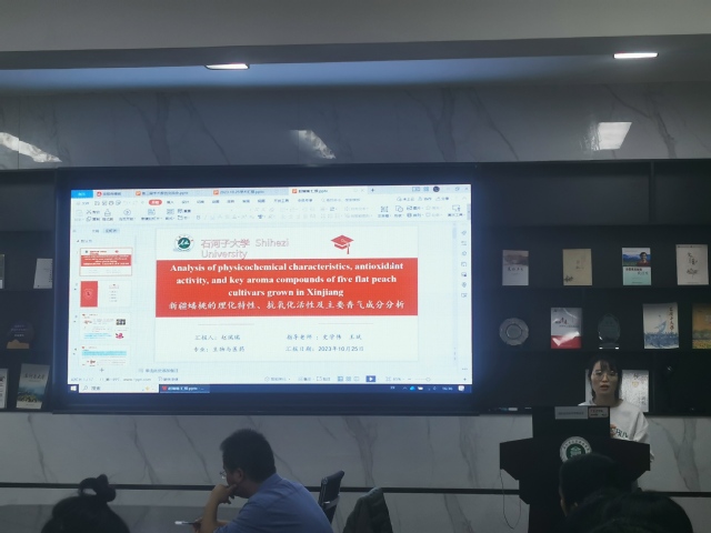 2021级食品科学与工程专业研究生蒋霞以《烹饪方式对深紫肉甘薯代谢产物的影响》为主题,进行了交流,生动讲解了不同烹饪方式对深紫肉甘薯的品质影响,综合分析了紫肉甘薯经蒸、煮、烘烤后的代谢产物,并表明83.5% 的代谢物在烹饪后保存完好。2021级生物与医药专业研究生赵瑞瑞围绕《新疆蟠桃的理化特性、抗氧化活性及主要香气成分分析》进行汇报,详细讲述了新疆不同品种的蟠桃具有的不同的香气成分,通过描述性感官评价明确蟠桃的特征香韵,并表明蟠桃中含有较高水平的酚类化合物,具有较强的抗氧化活性。