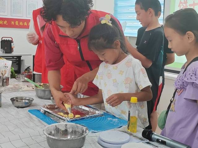 实践团成员们准备了桃酥、曲奇和蛋糕等的制作体验活动。小朋友们和实践团成员们一起动手体验烘焙的乐趣。实践团成员还准备了生活中食品化学小实验,带领小朋友们领略科学的魅力。