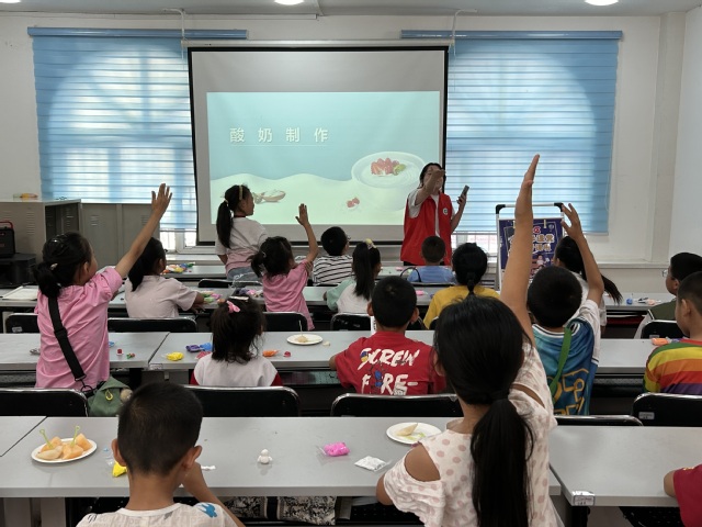前期的宣传工作准备充分,7月12日下午6时,活动场地涌来了大批积极前来参加“七彩红柳六点半”趣味课堂的小朋友。在本次课堂中,团队成员准备了制作酸奶、食品类趣味猜谜和太空泥等活动。课堂开始后,团队成员首先展示酸奶的制作过程,“在酸奶的制作中将酸奶与牛奶混合,请小朋友告诉我,两者谁的比例更大呢……”“酸奶!”小朋友们争先恐后地回答,团队成员热情地与小朋友们互动。
