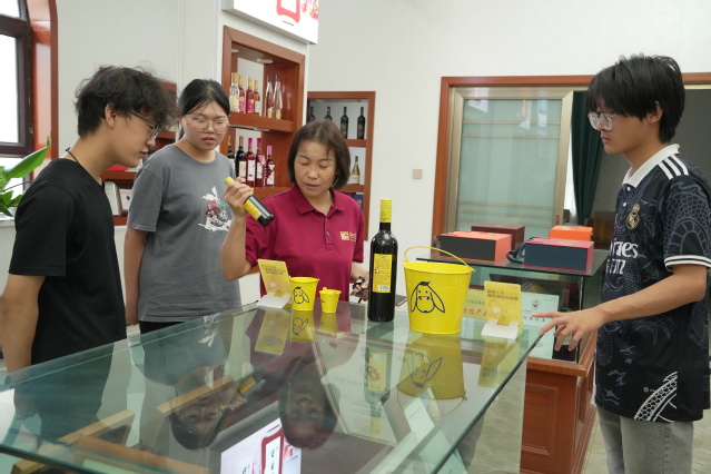 在酒文化展厅里,学生们品尝到佰年的独特产品“小甜甜”和“小毛驴”。活动过程中团队成员们与工作人员逐渐熟络,并开展了关于和硕县葡萄酒产业发展的问卷调查和深度采访。