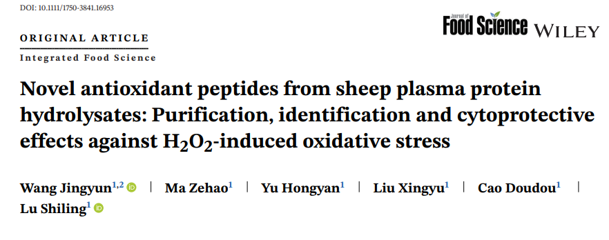 本研究以绵羊血浆水解物为研究对象,采用凝胶层析法、高效液相色谱联用串联质谱仪(LC-MS/MS)对其抗氧化肽进行了提取和表征。此外,利用过氧化氢诱导的氧化损伤Caco-2模型测定了多肽的细胞保护作用。本研究旨在从绵羊血浆蛋白水解物中分离出潜在的抗氧化活性多肽,以生产功能性保健食品和药物。