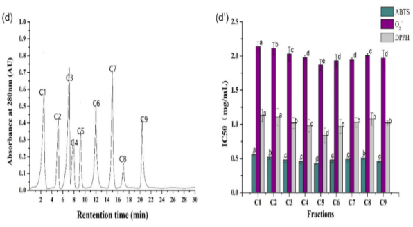 研究表明,许多动物血液蛋白水解物中的抗氧化肽已经被纯化和鉴定,包括来自猪血浆(WGPGVE)、鸭血浆(LDGP、TGVGTK、EVGK、RCLQ、LHDVK、KLGA和AGGVPAG)等等。血源性多肽的抗氧化活性与多肽长度、氨基酸序列组成和蛋白质结构中的位置等因素之间已经建立了相关性。然而,对绵羊血浆蛋白水解物中抗氧化肽的制备、鉴定还很少受到重视。