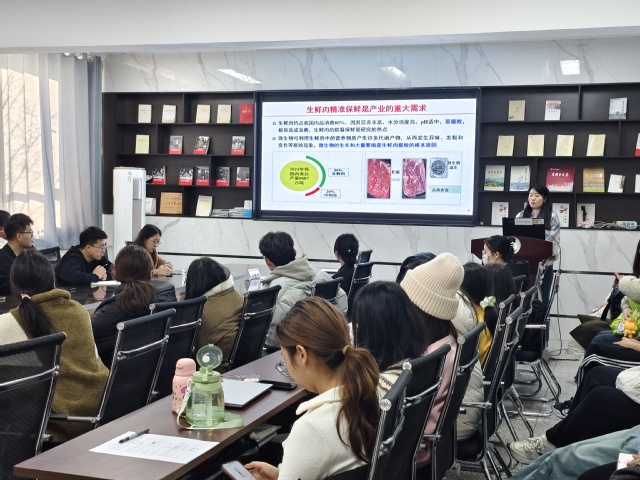 在本次学术交流会上,新晋教师文向圆博士以“托盘包装生鲜羊肉特定腐败菌致腐特性研究”为题,通过丰富的数据和直观的图表,深入浅出地阐述了推盘包装生鲜羊肉在特定腐败菌作用下的致腐机制,使同学们对这一复杂的食品科学问题有了清晰的认识。其后,2023级研究生李慧同学就“白斑狗鱼低温贮藏期间的肉质软化:基于溶酶体-线粒体凋亡途径”展开汇报。李同学深入探讨了白斑狗鱼体内溶酶体-线粒体凋亡机制,并分享了自己读文献的方法和学术论文投稿流程,帮助同学们全面了解学术论文发表过程,为未来的科研之路奠定了坚实基础。