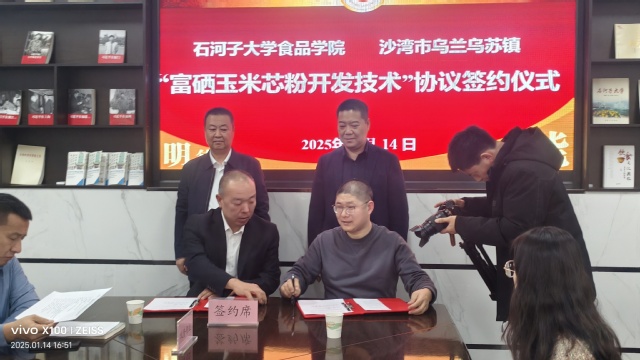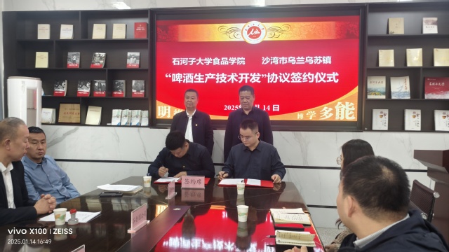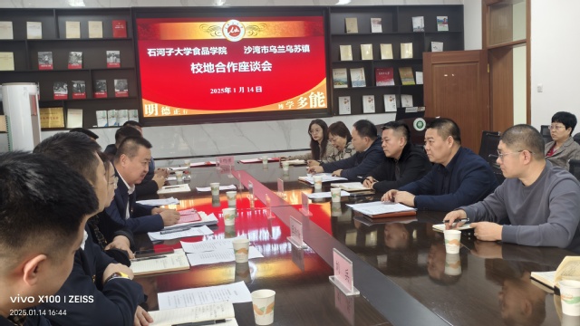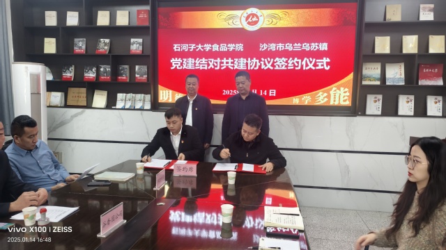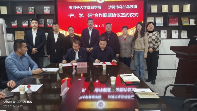 1月14日下午,在食品学院会议室,塔城地区沙湾市乌兰乌苏镇与bat365在线中文官方网站签订校地联合共建协议,着力在特色农副产品加工研发、提供实习创业实践基地以及基层党组织之间的融合互动等方面开展交流与合作,携手绘就校地协同发展崭新篇章。