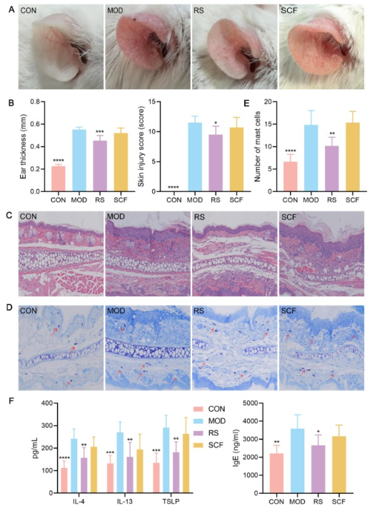 同时,基于鹰嘴豆抗性淀粉的营养特性及生理功能,团队开展了鹰嘴豆抗性淀粉针对皮肤抗过敏的研究,结果发现鹰嘴豆抗性淀粉通过调节肠道菌群产生丁酸盐影响Th1/Th2之间的免疫平衡,进而显著改善卡泊三醇诱导的特应性皮炎小鼠的临床症状。