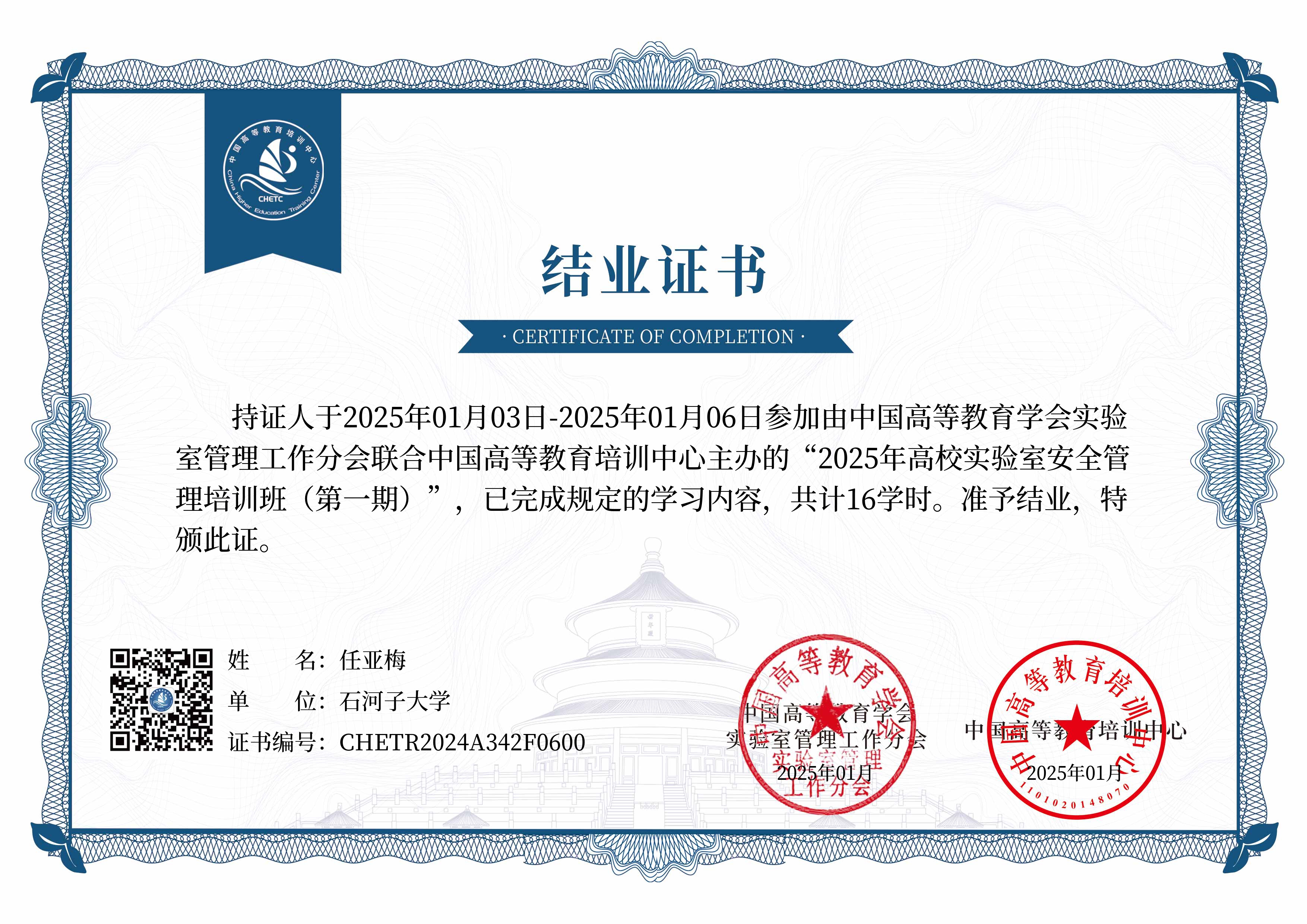 实验室人员参加实验室安全培训证书