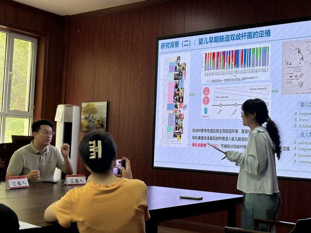 交流会上,2022级研究生赵全昊以“母婴间重要共生菌的发生及婴幼儿肠道菌群的系统发育研究”为题,深入浅出地讲解了母婴共生菌的作用机制、婴幼儿肠道菌群的特点及其垂直传递规律,为在场同学揭开了这一食品科学问题的神秘面纱。随后,2023级研究生张释月围绕“乳酸菌胞外多糖在食品工业中的研究进展”展开汇报,详细介绍了这一天然高聚物的特性、应用潜力及其在食品工业中的前沿研究,拓宽了同学们的学术视野,激发了大家对相关领域的浓厚兴趣。