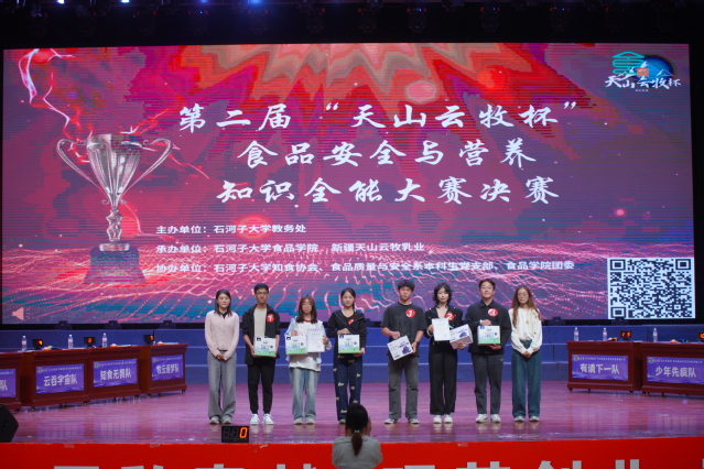 9月7日,石河子大学北区大会堂灯光如昼、掌声雷动,由石河子大学教务处主办,新疆天山云牧乳业有限责任公司、食品学院承办的第二届“天山云牧杯”食品安全与营养知识全能大赛在此迎来终极对决。从线上万人海选、实操技能沙场,到短视频创意答辩,8支“学霸战队”一路过关斩将,最终站上最高擂台,用知识与激情献上了一场“舌尖上的巅峰盛宴”。