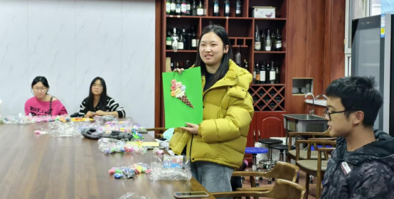 同学们在动手捏制食物粘土的过程中放松了身心,释放了学业和生活中的压力,也学会了用更有趣的方式表达情绪、梳理心境。同学的交流互动拉近距离、增进理解,现场满是温暖治愈的氛围,食品学院的方同学表示:“通过食物比喻自己还挺新鲜的,和其他同学聊创作思路时,发现大家都有相似的小困扰,瞬间觉得不孤单了。”