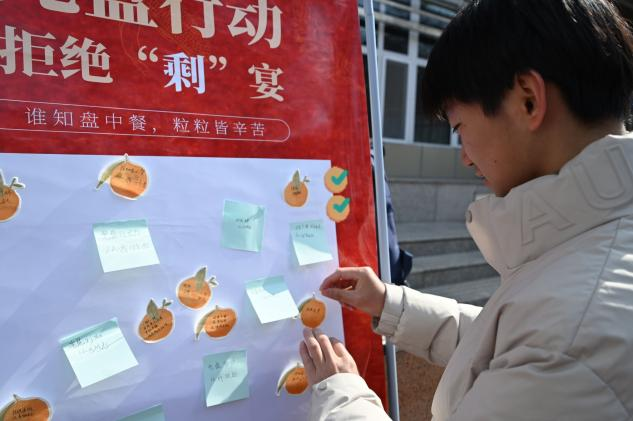 活动现场设置三大主题区域。在“食品安全区”,“食品谣言粉碎机”展板前,志愿者们以图文展示和互动问答的形式,为同学们揭开“食品添加剂都有害”“草莓打激素”等常见谣言的科学真相;在“健康饮食区”,同学们通过参与“减油减糖”科普学习及“合理膳食”电子游戏体验,直观了解膳食平衡的重要性。在“光盘行动区”,一块大型“光盘承诺墙”格外醒目,同学们纷纷写下“我承诺每餐光盘”等感言,以此许下节约承诺。